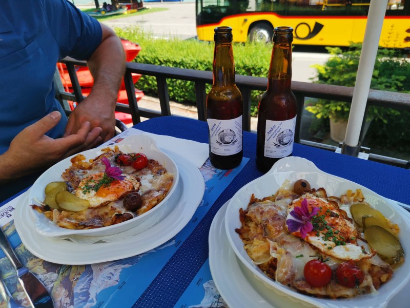 Im Restaurant Oberländerhof – den wir ohnehin sehr mögen – warteten die nächsten zwei Biere und eine herrlich währschafte Rösti mit Käse und Spiegelei. Es war unglaublich lecker und das warme Wetter machte Durst. Danach brachte uns das Dampfschiff nach Burgseeli, wo wir zur nächsten Station hinaufsteigen mussten. In der Badi Burgseeli gab es erneut zwei Biere, und natürlich sprang ich auch dort wieder ins Wasser. Bei dieser Hitze war das pure Wohltat. Sebastian sah lieber vom Badi-Restaurant aus zu.