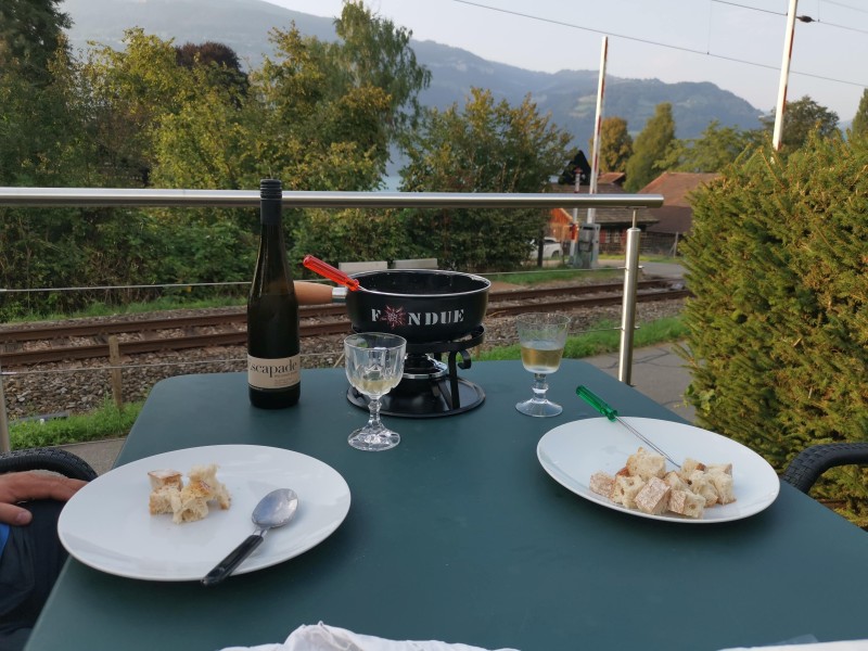 Zurück in Interlaken folgten die letzten zwei Biere – für mich dann doch zu viel. Ich stieg auf Ice Tea um, während Sebastian tapfer weiterprobierte. Den Abend liessen wir gemütlich im Garten unseres AirBnB ausklingen – mit Käsefondue und einem weiteren Sonnenuntergang am Thunersee.
