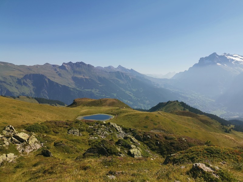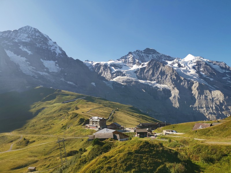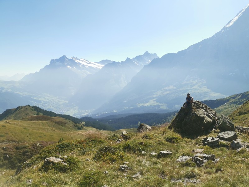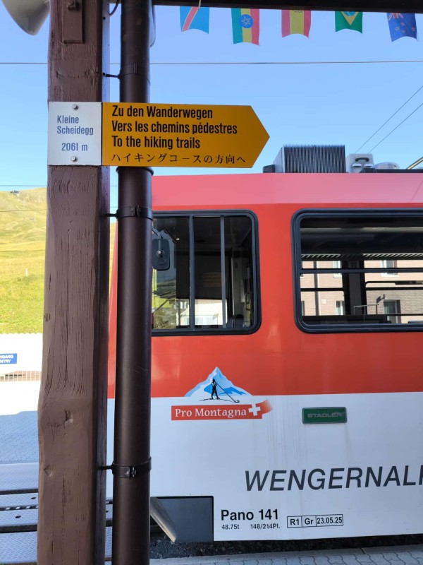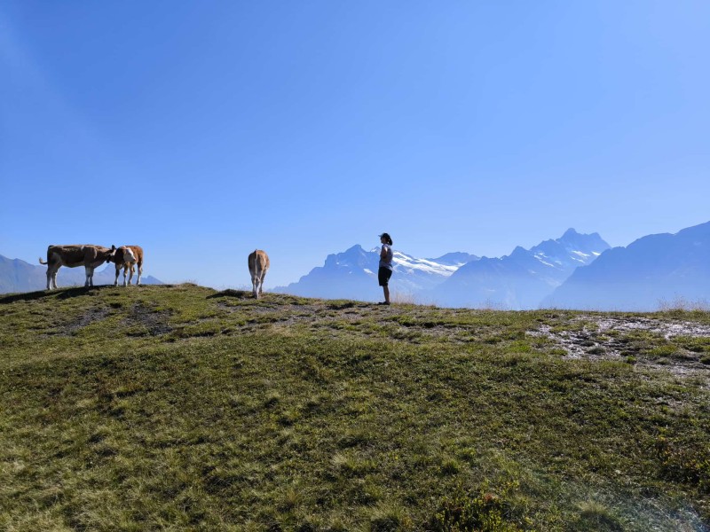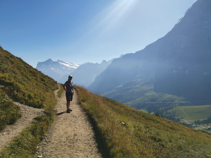 Wir wollten der Hitze entfliehen und suchten Abkühlung in der Höhe. Unser Ziel: die Kleine Scheidegg auf über 2000 Metern. Ab Grindelwald Grund brachte uns der Zug hinauf – direkt in eine Touristenhochburg. Also nichts wie weg und ab auf den Wanderweg Richtung Berggasthaus Männlichen. Unterwegs begegneten wir zwar noch einigen Menschen, aber es wurde schnell ruhiger. Die Berglandschaft war atemberaubend: blühende Wiesen, majestätische Gipfel, klare Luft. Trotz der Höhe war es erstaunlich warm, und wir kamen ordentlich ins Schwitzen.