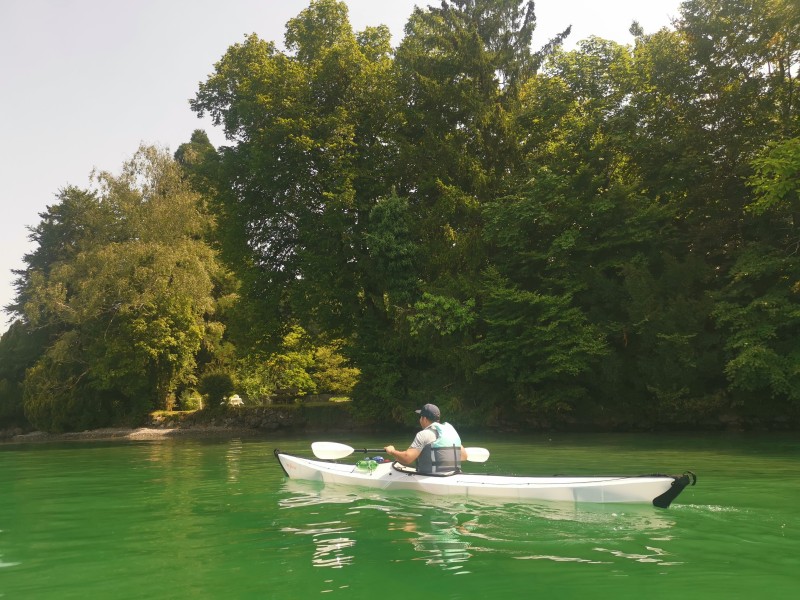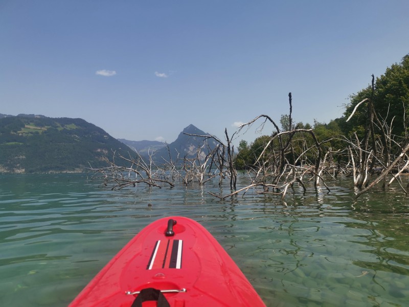 Der nächste Tag zeigte sich von seiner schönsten Seite: sonnig und herrlich warm. Perfektes Kajakwetter. Dieses Mal hatten wir neben dem Oru-Faltkajak auch mein Wildwasserkajak dabei. Zwar war ich damit nicht ganz so schnell wie Sebastian im Oru, aber für eine gemeinsame Tour reichte es allemal. Danach liessen wir uns von der Sonne trocknen, badeten im See und ich übte noch ein paar Eskimorollen im Kajak.
